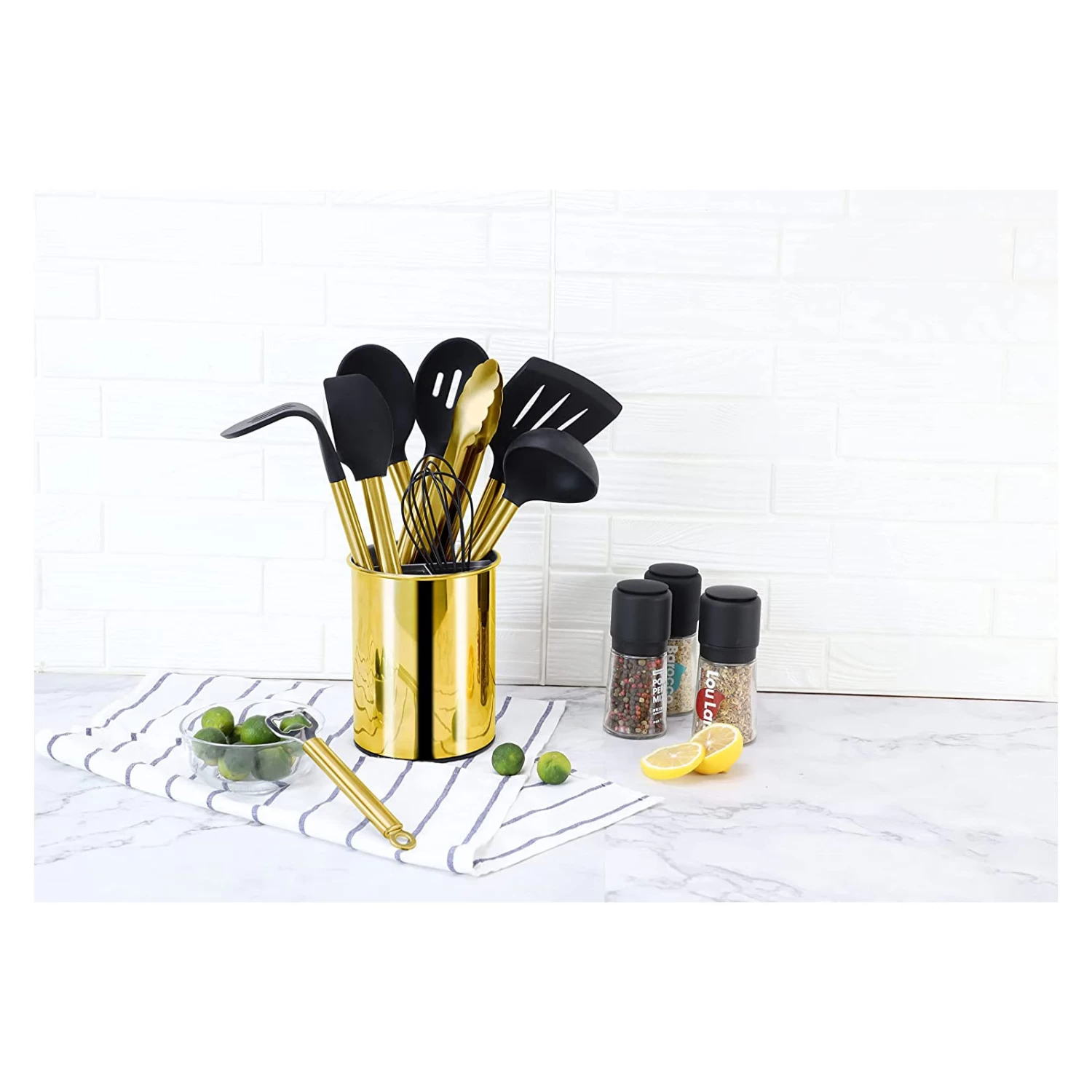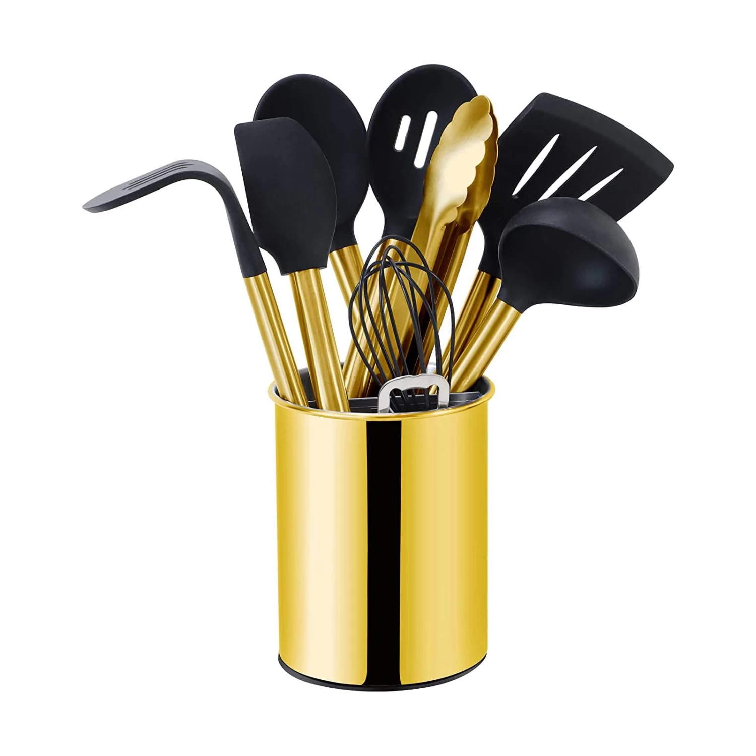 Set-Zusammensetzung: Utensilienhalter, Schlitzwender, Fester Löffel, Schneebesen, Suppenlöffel, Geschlitzter Löffel, Küchenschaber, Kartoffelstampfer, Servierzange, Flaschenöffner.