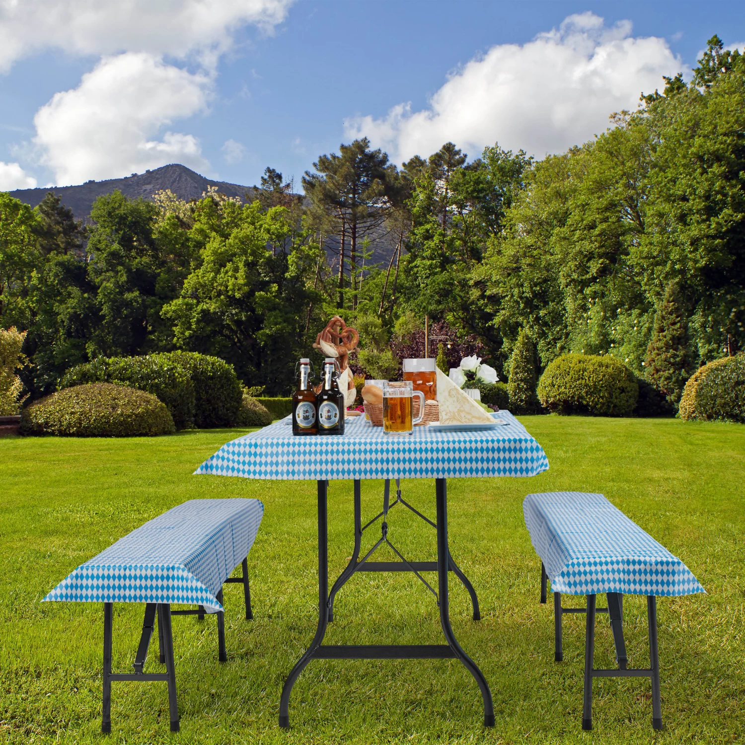 Sie wollen ein Bierfest veranstalten oder bei der Gartenparty bayrisches Biergarten-Feeling versprühen, dann darf das 24er Set blau-weiß karierte Bierzeltgarnitur Auflagen nicht fehlen. Das strapazierfähige Set bestehend aus 8 Biertischauflagen und 16 Bierbankschonern schützt Ihre Gartenmöbel vor Kratzern und Flecken und wertet Ihre Bierzeltgarnitur optisch auf. Die Festzeltauflagen bestehen aus abwaschbarem Vliesstoff und können im Gegensatz zu Papiertischdecken wiederverwendet werden.