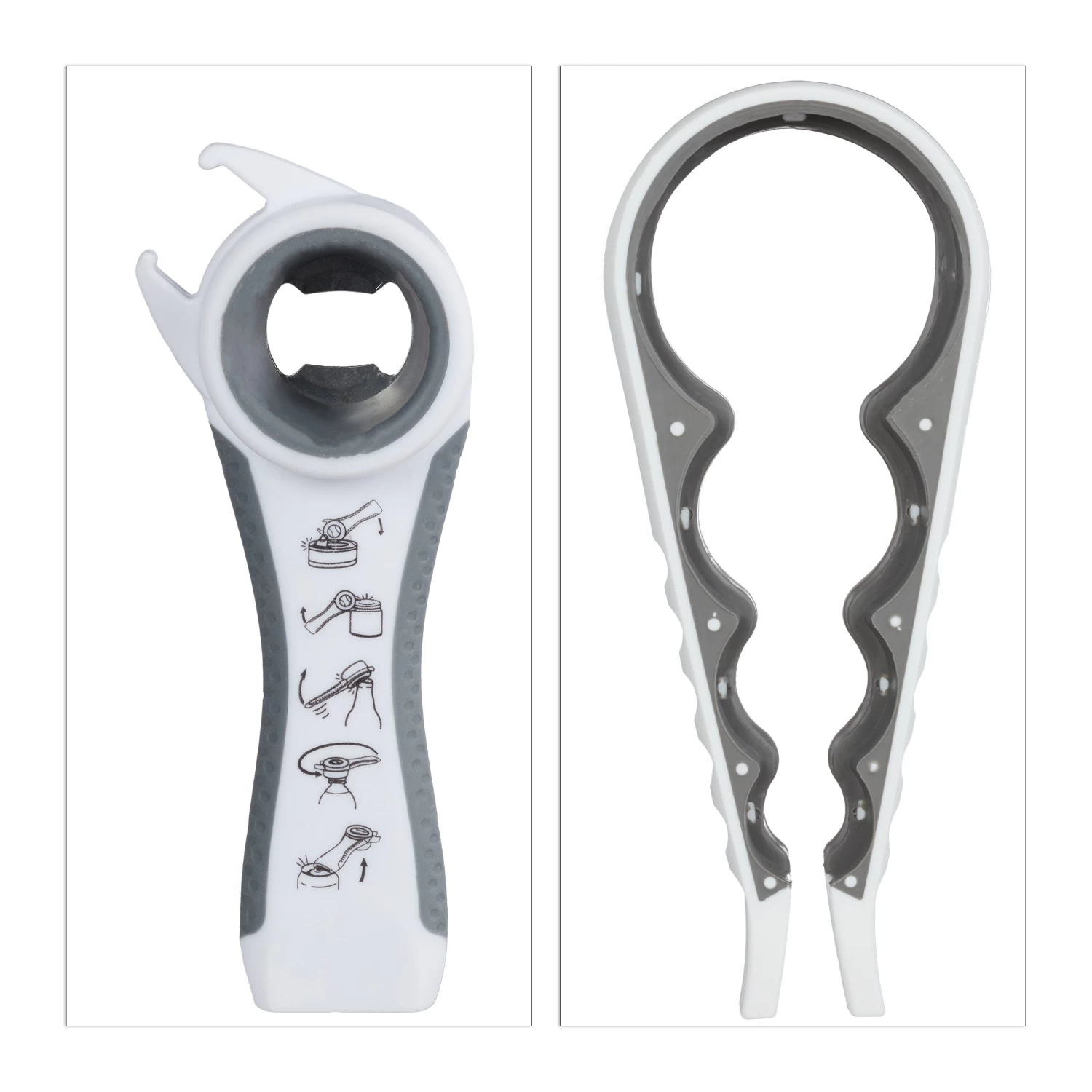 Ob Wasserflaschen, Coladosen, Bierflaschen oder aber auch Gurken- sowie Marmeladengläser, mit der fehlenden Kraft bleiben sie alle geschlossen. Dieses starke Flaschenöffner Set lässt Sie nicht im Stich. Der Multideckelöffner hilft Ihnen Schraubverschlüsse in 4 Größen problemlos aufzudrehen. Mit dem Multifunktionsflaschenöffner sagen Sie unterschiedlichen Verschlüssen durch hebeln, ziehen und drehen den Kampf an. Die rutschfesten Griffe sorgen dabei für den notwendigen Halt.