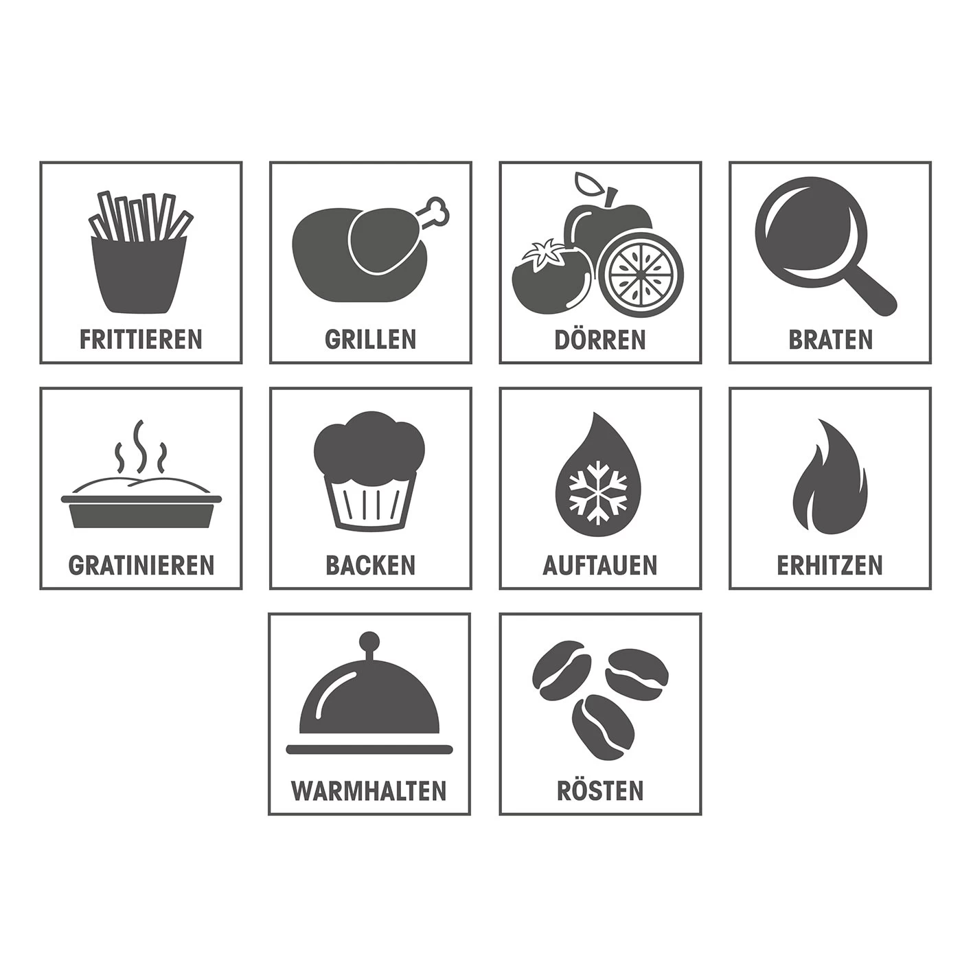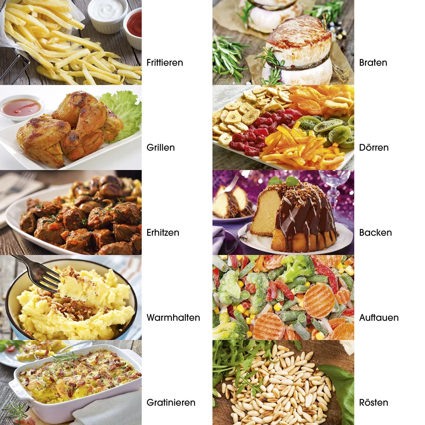 – Hinweise: Dieses Gerät arbeitet mit Heißluft und ist keine herkömmliche Fritteuse, die mit Öl oder Frittierfett befüllt wird. Es eignet sich zum Braten, Backen, Grillen, Dörren, Warmhalten oder Auftauen von Lebensmitteln. Generell funktioniert es wie ein handelsüblicher Umluftofen. Das Gerät ist nicht zum Zubereiten bzw. Erhitzen von Flüssigkeiten wie Suppen oder Soßen geeignet.
