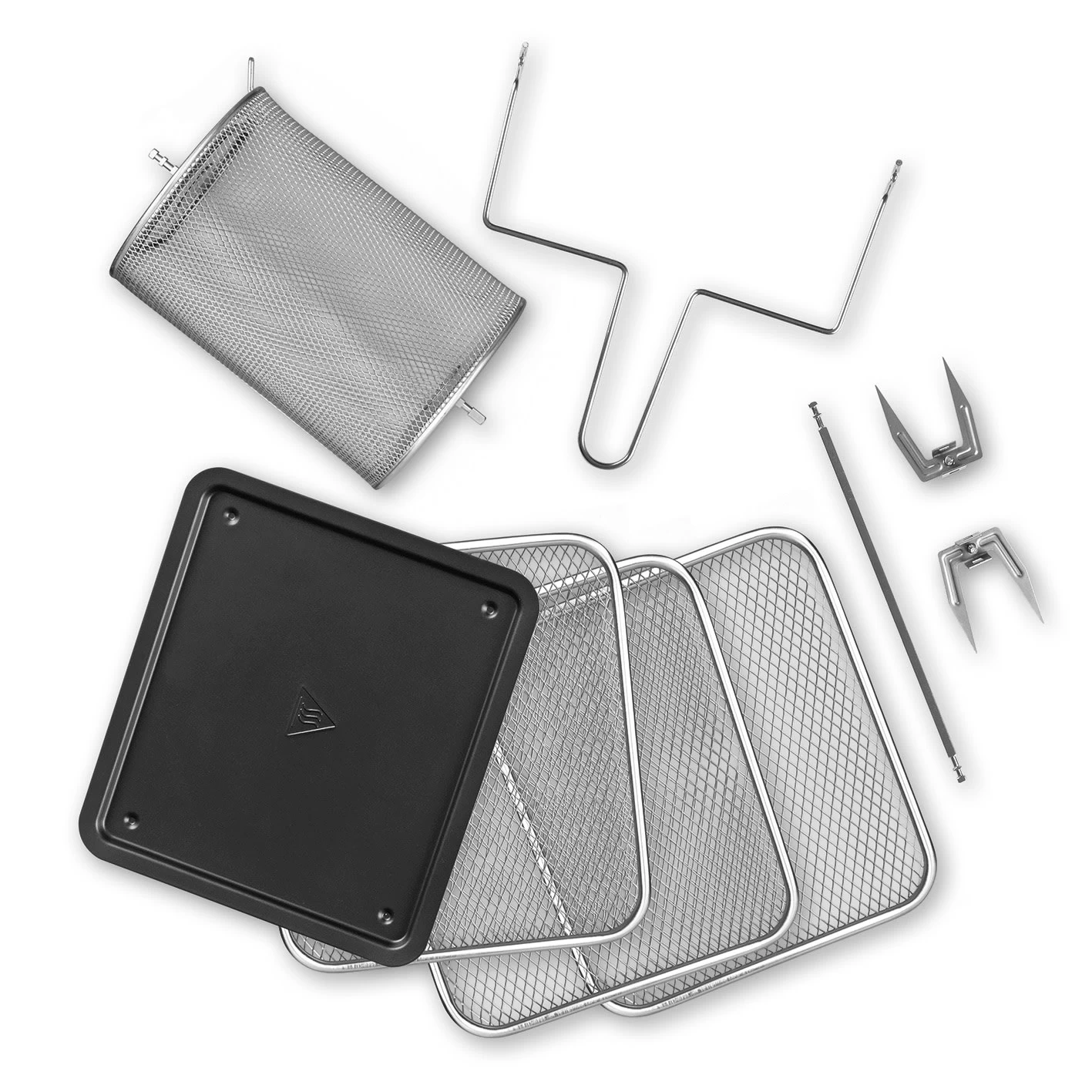 – Lieferumfang: 1x Haupteinheit, 1x Drehkorb, 2x Drehspieß-Forke mit Feststellschraube, 1x Welle des Drehspießes, 1x Entnahmehilfe, 3x Backgitter, 1x 7 Fettauffangschale