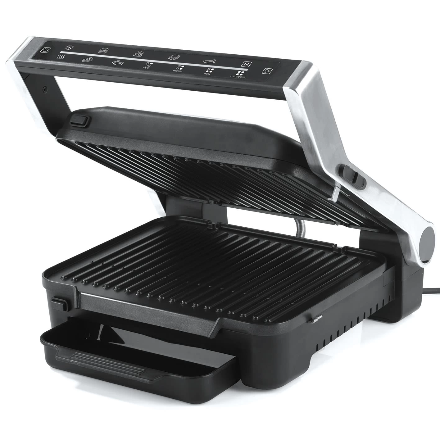 So garst du auf den Punkt – auch als Anfänger! Mit dem MAXXMEE Digital-Kontaktgrill bereitest du Fisch, Steaks, Sandwiches, Burger, Würstchen und Geflügel zu wie ein Profi. Einfach eines der 6 Grillprogramme auswählen, das entsprechende Gargut auf den Grill legen, zuklappen und abwarten. Der fortlaufende LED-Farb-Countdown zeigt dir an, wann dein Grillgut verzehrfertig ist. Bei den Programmen Fisch und Steak kannst du zudem zwischen den Garzeiten rare, medium, well und well done wählen.