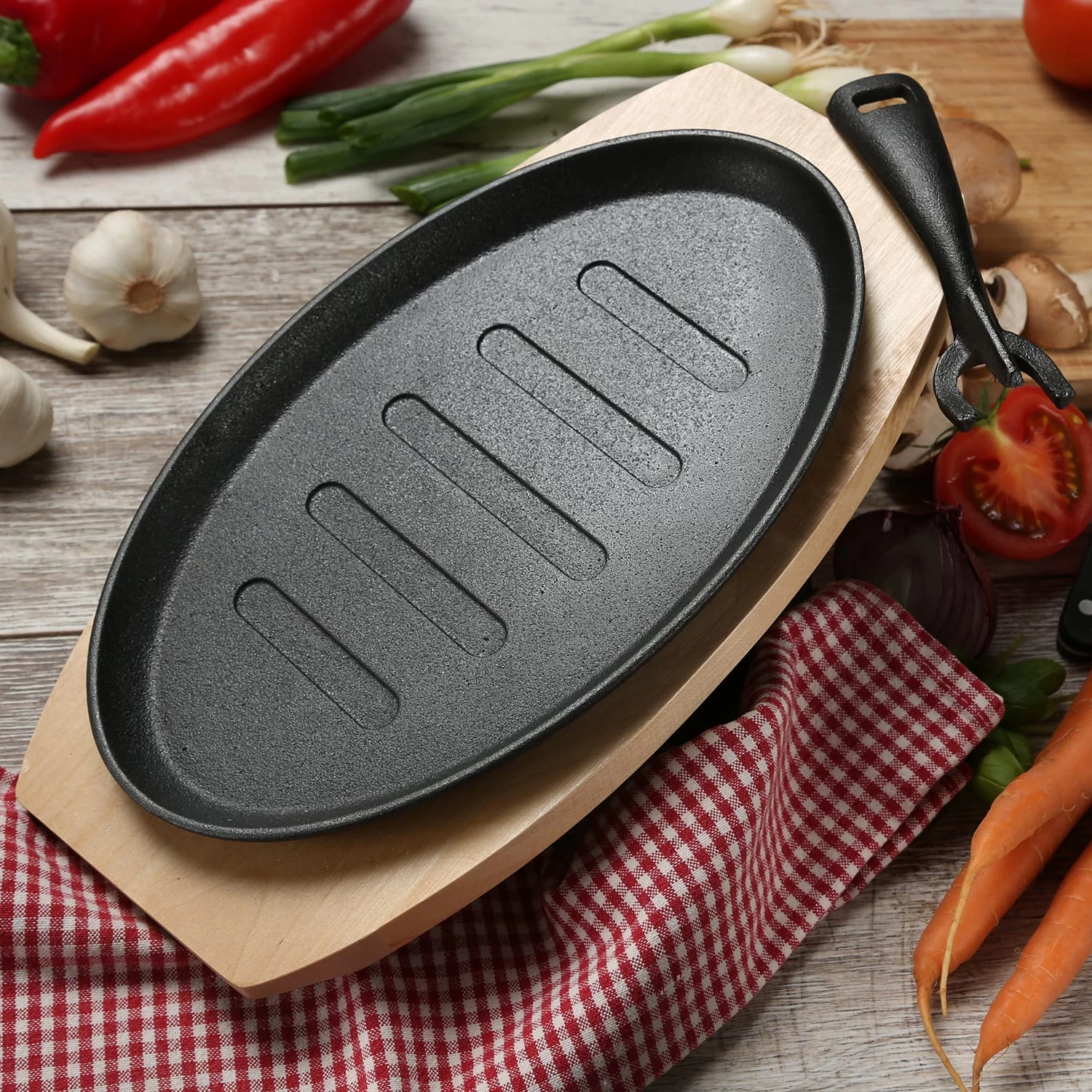 Gusspfanne mit abnehmbaren Stiel u. Holzuntersetzer – Gusseisen – L: 27cm – Servierpfanne – oval Kochen und Grillen am offenen Feuer wie es Menschen bereits seit Jahrtausenden tun – die ursprüngliche Art zu Kochen!